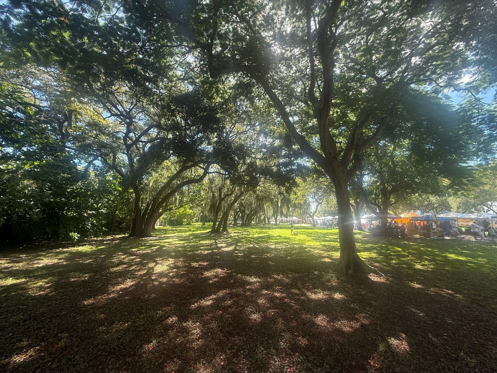 While the park is active every day, Saturday morning is the main event. A free, community-led yoga class meets at 10 AM beneath the banyans. By the time mats are rolled up, the farmers market is in full swing—stalls of fresh produce, breads, juices, and handmade goods stretch under the shade.